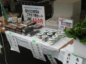 宍粟市波賀町の斉木のわさび加工グループの女性のグループが、地元の葉わさびを使い、まず「葉わさび漬け」を作り、土日限定で「葉わさび寿司」を出荷されます。予約で売れてしまうことも珍しくありません。