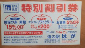 2店舗でお食事されますと、道の駅はが特別割引券が貰えます!この割引券でお土産用の素麺が・・・なんと!15%オフです!!(その他の割引商品との併用はできません)この夏は、避暑地はがへお越し下さい。