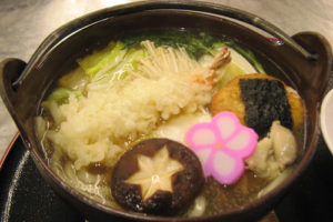 雪の下野菜(白菜・白ネギ)をたっぷり使った人気の「鍋焼きうどん」1080円