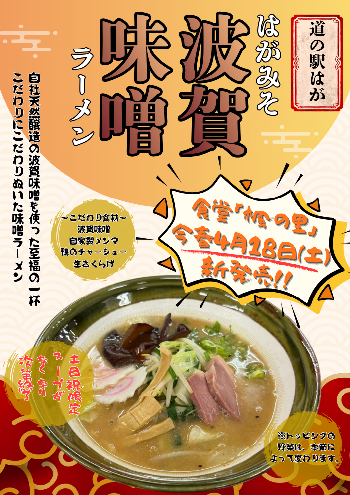 | 今春4月18日~食堂新発売メニュー「波賀味噌ラーメン」 | |